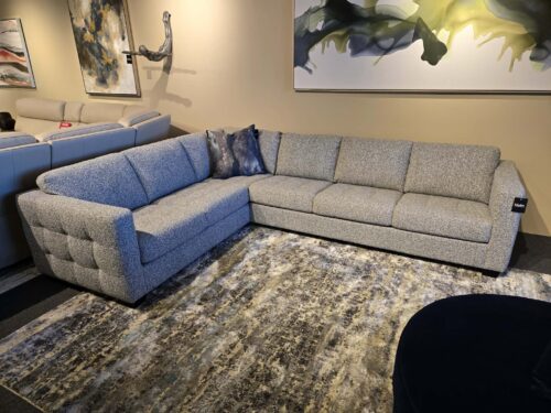 Italian made leather/fabric mixed sectional with articulating headrests. This sectional is also available the opposite direction.
