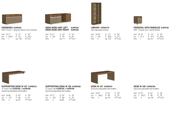The collection includes two desks: one with integrated storage elements, the other more essential, ideal for pairing with other storage pieces. With dedicated compartments for documents and a variety of storage types, the system helps maintain order and clarity throughout the space.