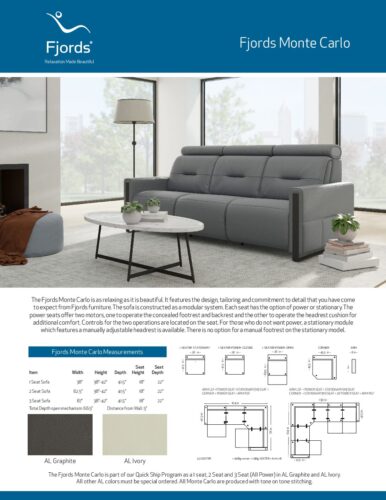 The Fjords Monte Carlo sofa is as relaxing as it is beautiful. It features the design, tailoring and commitment to detail that you have come to expect from Fjords furniture. The Monte Carlo sofa is constructed as a modular system. Each seat has the option of power or stationary. The power seats offer two motors, one to operate the concealed footrest and backrest and the other to operate the headrest cushion for additional comfort. Controls for the two operations are located on the seat. For those who do not want power, a stationary module which features a manually adjustable headrest is available.