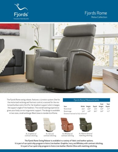 The Fjords Rome swing relaxer, featuring three motor system, features controls for reclining, power lumbar support and power head / neck support. These details makes the seating experience ergonomic and gives your lower back and neck correct support. Available in all our leathers and select fabrics, the Rome is available in two sizes, small and large. Black base is standard on Rome.